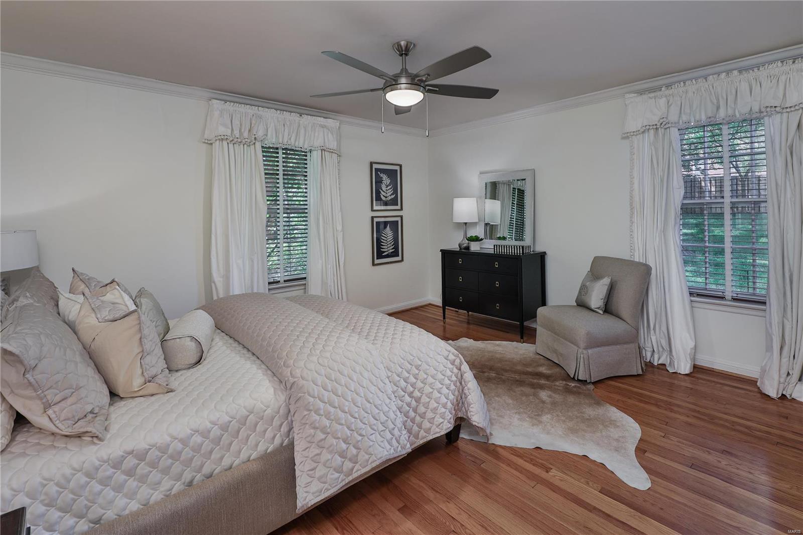 This bright and cheery 3BR, 1 1/2 bath one story home really has it all! Centrally located on a lovely tree lined street, this home has been beautifully updated by the current owner and offers a freshly painted, open floor plan with hardwood floors and many oversized windows with plantation shutters or Hunter Douglas blinds. The spacious living room has a remote controlled gas fireplace with an antique mantle with Carrera marble surround and the dining room has sliding doors which open to the patio and gorgeous fenced yard with mature trees and lovely landscaping. The kitchen was remodeled in 2017 with Beck/Allen custom cabinetry, Silver Pearl granite countertops, stainless Whirlpool appliances and Wood Solutions ceramic floor plus a stack washer and dryer. All three bedrooms are spacious and light filled and the primary bedroom has two closets. The primary bath was remodeled in 2021 with Carrera floor tiles and a Carrera subway tiled shower with Kohler fixtures. Don't miss this one!